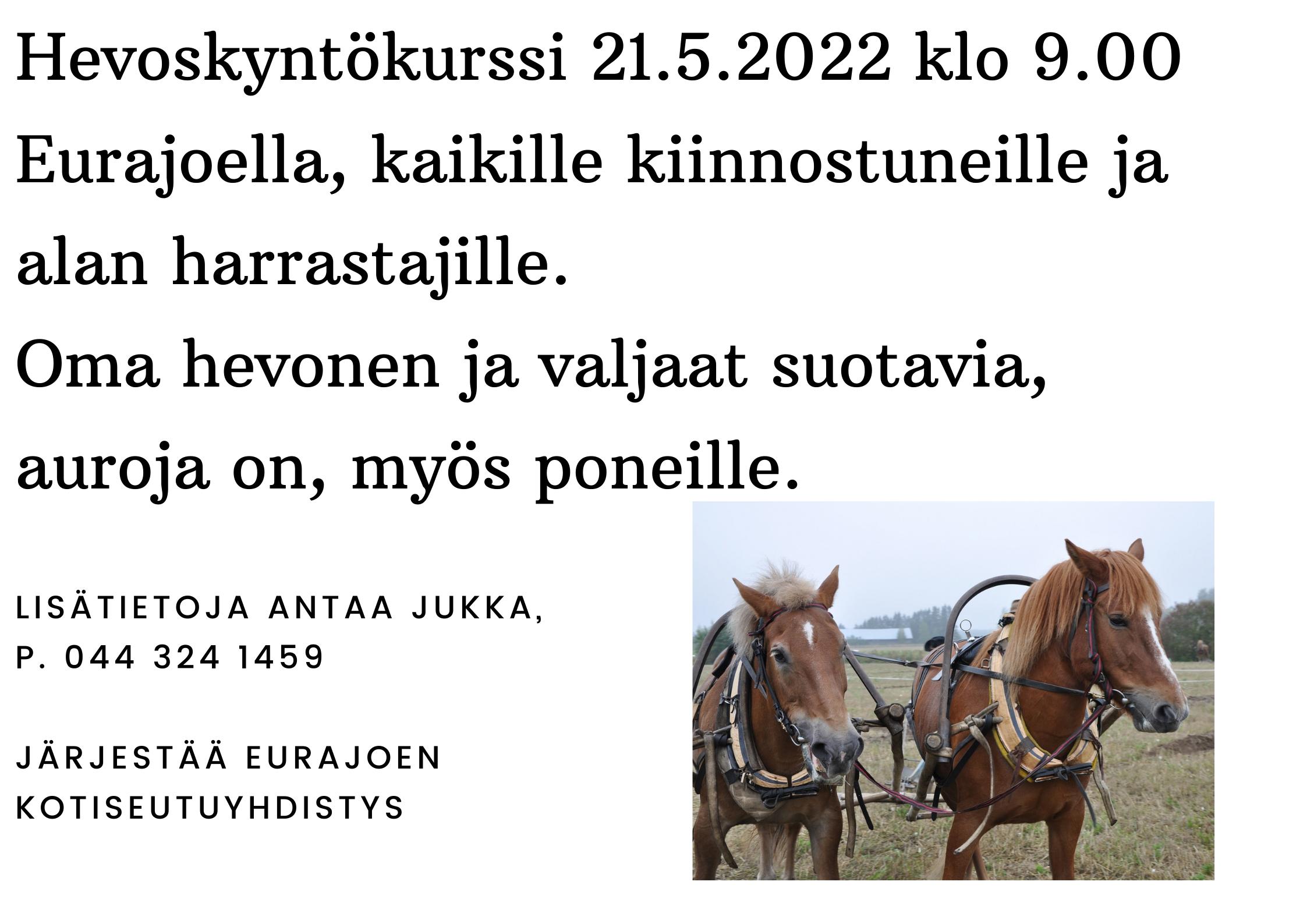 Haluatko oppia hevoskyntöä tai valmistella hevosta vuoden 2022 hevoskynnön SM-kisoihin, jotka pidetään 10.9.2022 Vuojoen kartanolla. Nyt tähän on mahdollisuus Eurajoella.