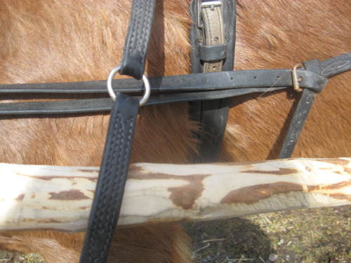 2. Laske vapaa pää aisan yli n.10 cm mahavyön etupuolella. Remmin puoliväli tulee suunnilleen aisan kohdalle. Yläpuolelle on mieluummin jätettävä remmistä pidempi osa.