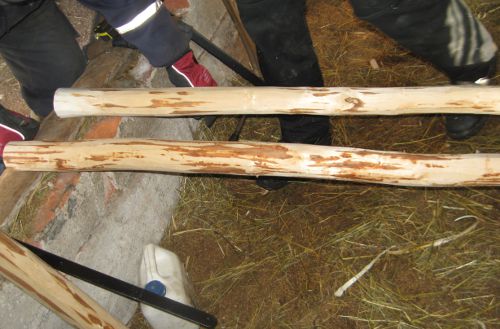 2. Aihiot laitetaan toiset päät koholle ja katsotaan niiden mahdollinen käyryys. Tyveen merkataan yläpuoli, johon tulee aisarauta kiinni, jolloin kovera puoli jää hevoseen päin ja näin hevosella on lisää tilaa liikkua aisojen välissä.