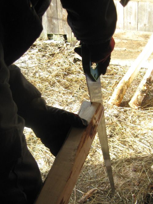 7. Aisanpäähän sahataan tasoitetusta kohdasta halkaisijan poikki n.5 cm syvä viilto kiilaa varten jolloin viilto tulee aisaraudan kohdalle.