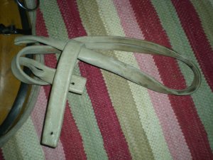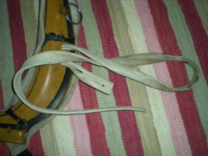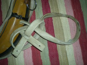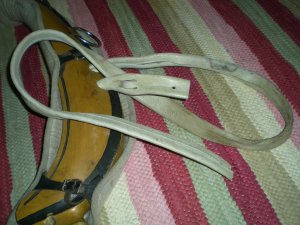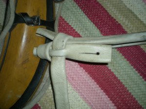 - Rahkeenpää pujotetaan ensin ylimmästä reijästä läpi ulkoa sisällepäin, sitten alemmasta reiästä takaisin ulospäin niin että rahkeessa oleva reikä tulee n. 5cm längen ulkopuolelle. Rahe painetaan längen sisä puolella olevaan koloon niin, ettei se paina hevosen lapaan.