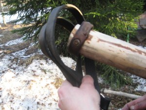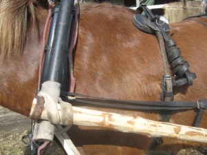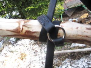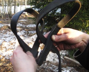 - 4. Kierrä remmi vielä aisan sisäpuolelta ja nyt ylös lähtevän remmin edestä niin, että saat remmin pujotettua äskeisen kierroksen alta. Kiristä aisan ympärille. Jos aisa on jäinen tai jos aisaremmit ovat uudet ja jäykät tai jos aisaremmit ovat hyvin pitkät, voit vielä tehdä ylimääräisen kierroksen, jotta aisaremmi varmasti pysyy paikoillaan. Aisaan voi myös tehdä valmiiksi sopivalle kohdalle nahkaisen ”stopparin”, jonka etupuolelle solmu tulee.