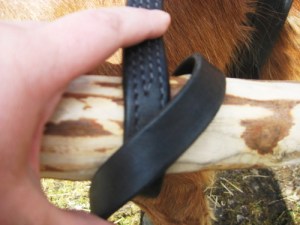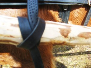 - 2. Laske vapaa pää aisan yli n.10 cm mahavyön etupuolella. Remmin puoliväli (rengas) tulee hiukan aisan yläpuolelle. Yläpuolelle on mieluummin jätettävä remmistä pidempi osa.