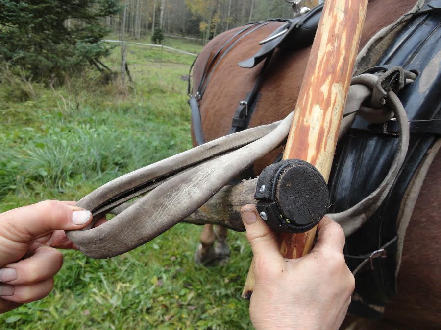 Pidetään oikealla kädellä luokki ja aisan pää yhdessä. Vasemmalla kädellä otetaan rahkeen lenkistä kiinni ja tuodaan rahje luokin takaa aisan yli.